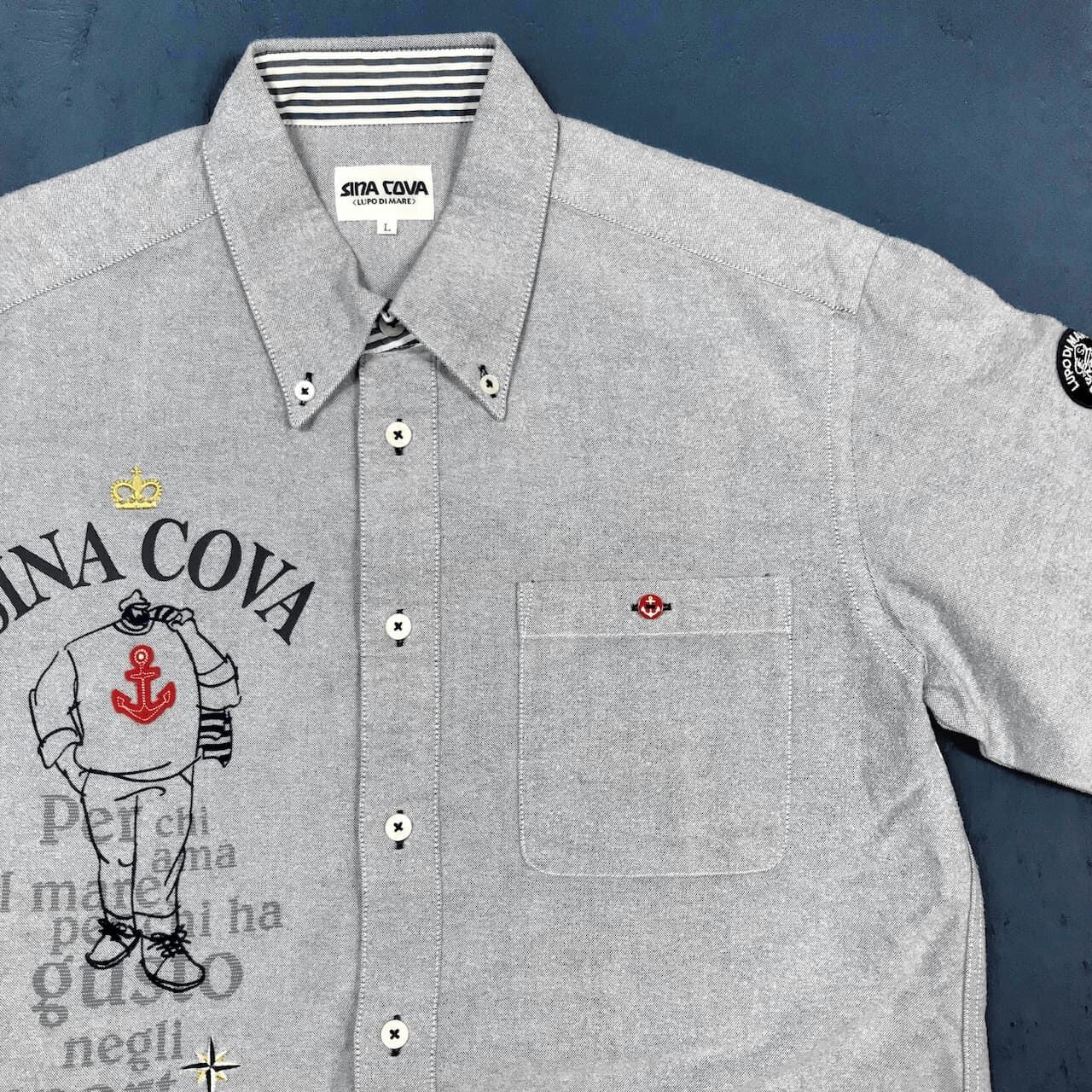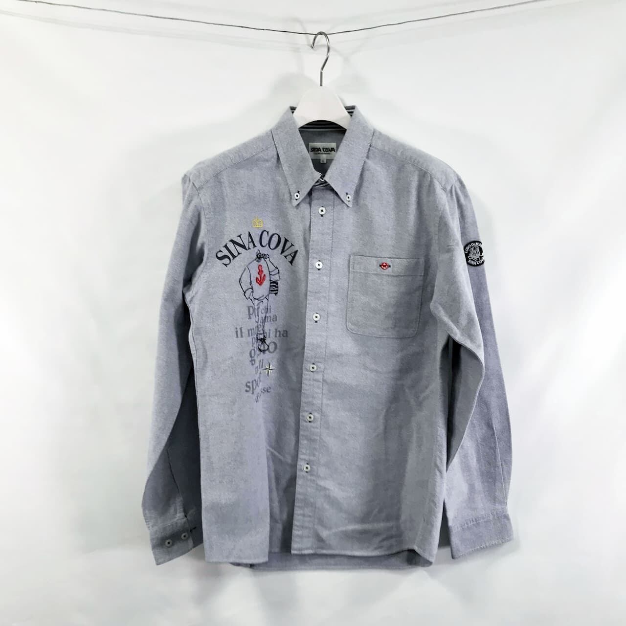 右胸の大きなプリントと刺繍のモチーフが目を引く、2014年秋冬モデルのデニムシャツです。