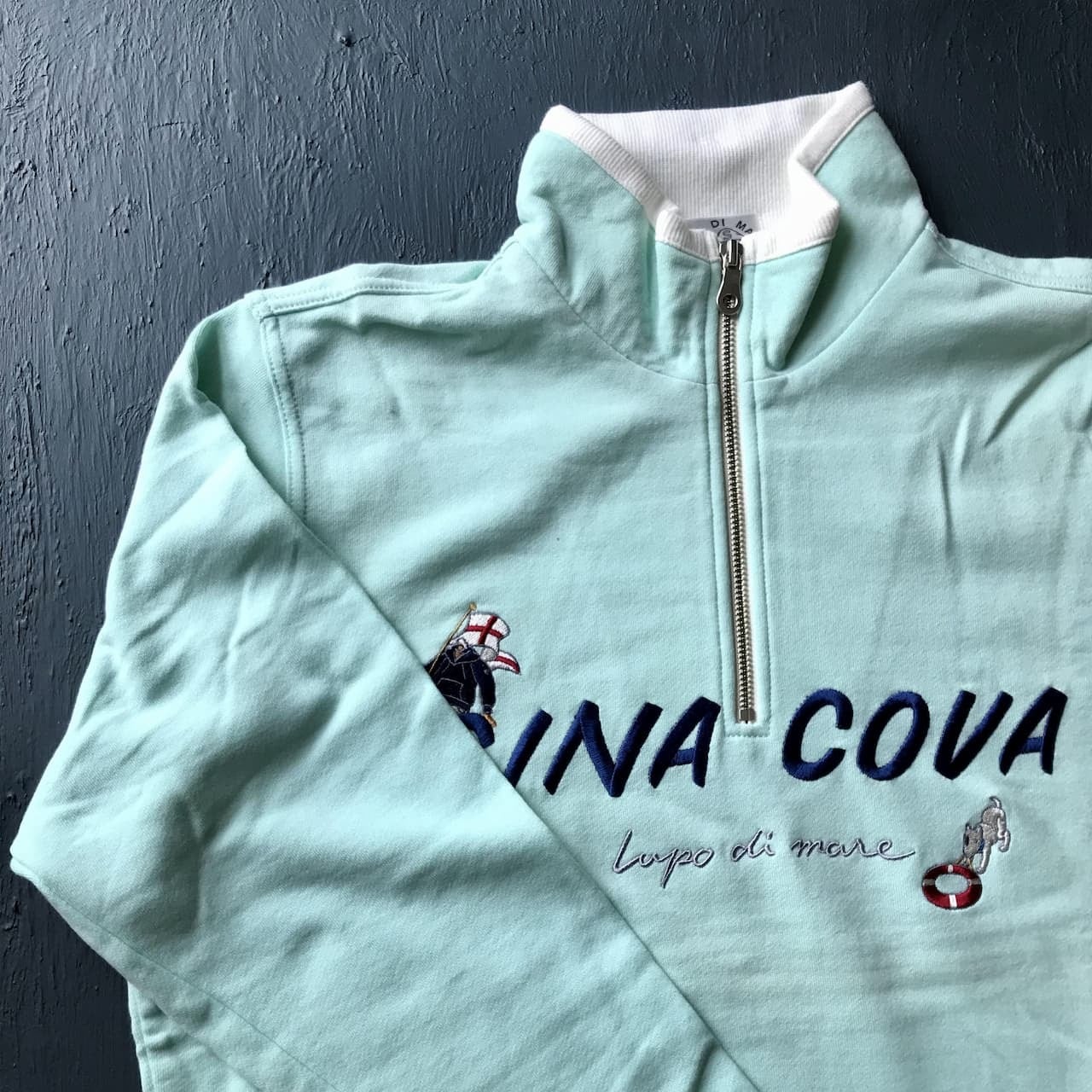 胸元に配置されたSINA COVAの周りで、信号旗を持つキャプテンと浮き輪で遊ぶ犬が可愛いモチーフです。